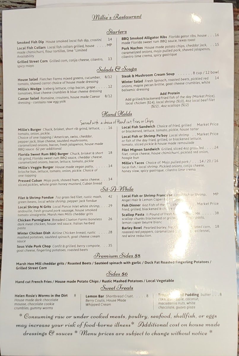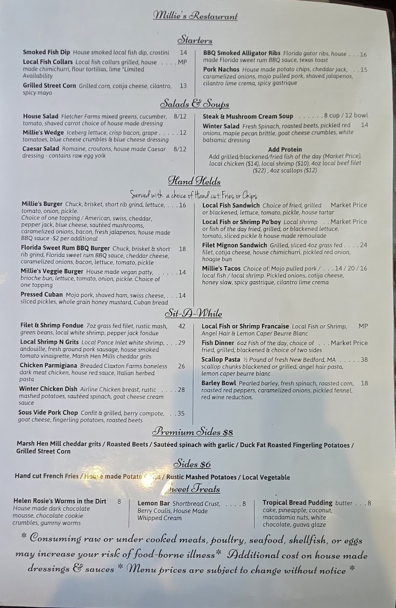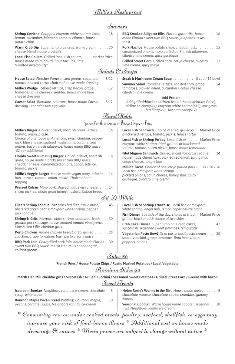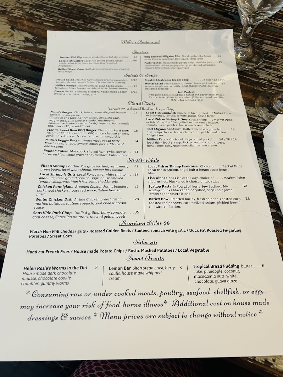 Overall, the menu at Millie's invites guests to enjoy the simple pleasure of well-prepared food made with care, ideal for slow, comfortable meals that match the gentle pace of coastal Florida living.