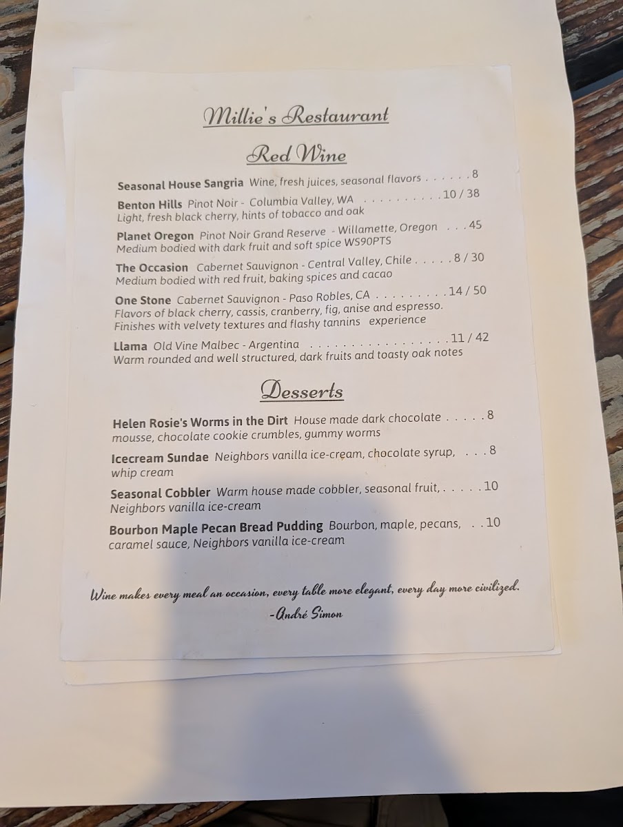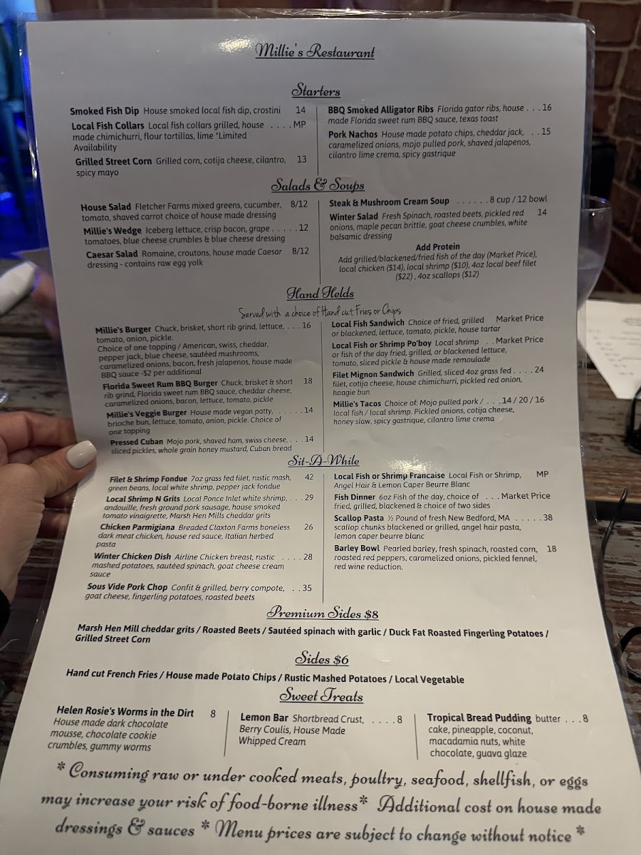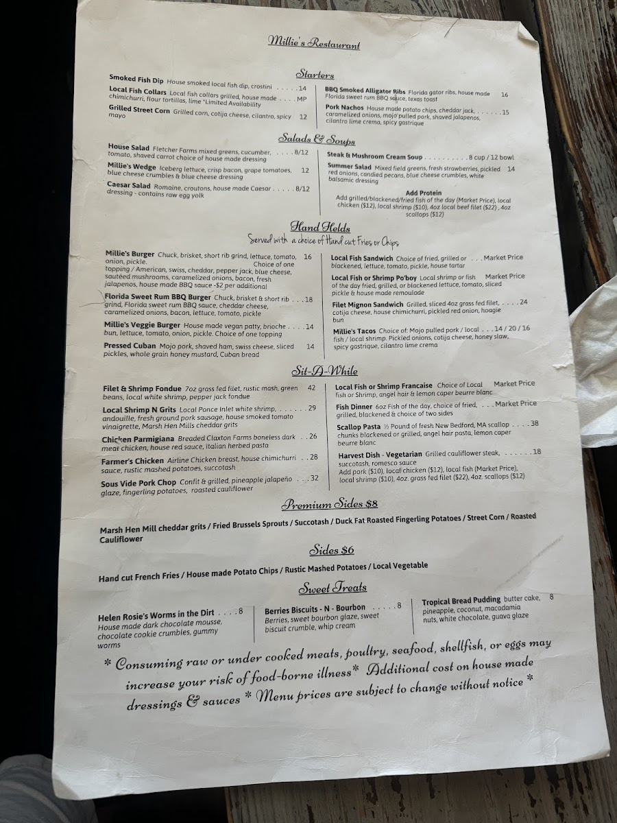 Overall, the menu at Millie's invites guests to enjoy the simple pleasure of well-prepared food made with care, ideal for slow, comfortable meals that match the gentle pace of coastal Florida living.